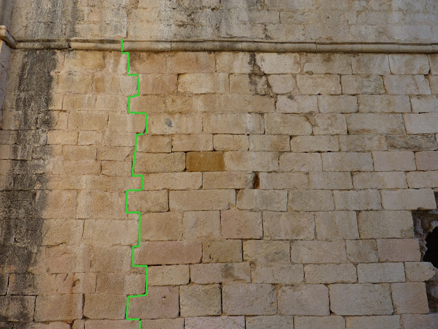 Y puestos a razonar, porqué este relevo de canteros? Porqué la "frontera" entre ellos es vertical y no horizontal? No te da la idea que fuera una reparación tras un derrumbe parcial, o fruto de una reforma del templo en una época posterior a su inicial construcción?...