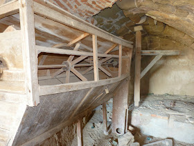 La sala está abovedada y conserva, (es una manera de hablar, pues en fotos de no hace mucho se veían más cosas), parte de su maquinaria.