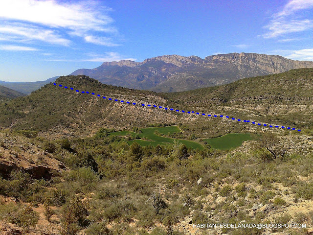 Desde allí tendremos la siguiente visión de la sierra que debemos afrontar por su parte baja donde se inicia un sendero. Hay que descender desde la casa por los campos ya que no hay camino.