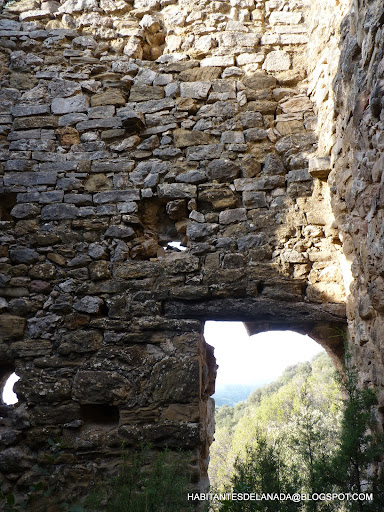 Llego a la torre, junto a la que se hallan restos constructivos de escasa entidad, tras algo más de tres kilómetros. La senda atraviesa un terreno agreste y salvaje, se adentra por el profundo barranco de Sant Pere entre un absoluto silencio. Aquí ni hay cobertura móvil ni otro ser humano que los cazadores desayunando en la caseta de Figuerola, otro despoblado que he dejado bastantes kilómetros atrás.