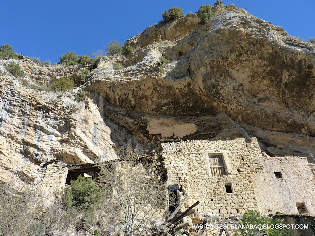 Mongay se situa bajo una balma que va mermando en tamaño hasta quedar en nada junto a su actual pista de acceso. En dirección al río el estrato calizo vuelve a tomar altura. Una altura considerable que me hace sospechar. Sospecho que es de tal calidad la protección de la balma, que su colonización es casi "de cajón".