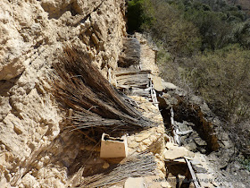 Desciendo en dirección contraria al pueblo hasta hallar un desvío hacia el norte. Por nuestra derecha se ve aflorar la roca con algún desprendimiento. Siguiendo por el pie del estrato se adivina un camino de herradura y dos tramos empedrados, cosa que me da ánimos.
