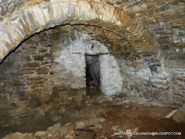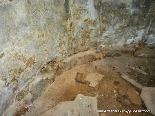 Y entro en el pozo forrado de losas que constituye la planta baja...(al fin). El retranqueo interno me hace pensar que se trata de un lagar o depósito en todo caso, a pesar de que parte de su pared es visible en la bodega no se aprecia o no he sabido encontrar en élla por dónde se vaciase: