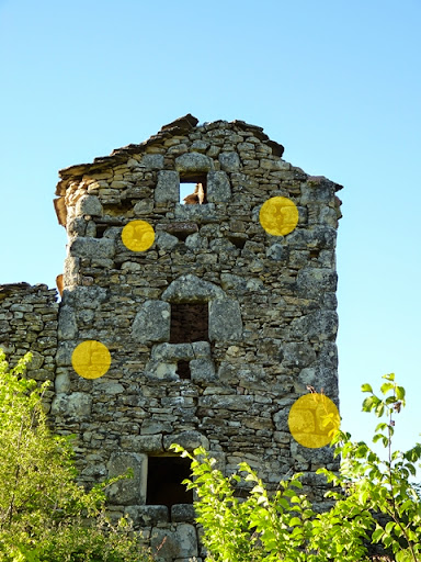 Vemos aquí el lado sur y este de la torre. Las losas encajadas en el lado este corresponden a un recrecido posterior a la construcción original. Posterior pues condenó la ventana aspillerada de la segunda planta en este paramento.