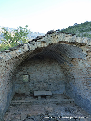 La ermita está sobre un pequeño cerro que nos queda a la derecha del barranco principal, no existe camino y hay que subir campo a través. Primero encuentro la casa del ermitaño, sus dos plantas tienen entradas propias, la baja se cubre con bóveda de cañón.